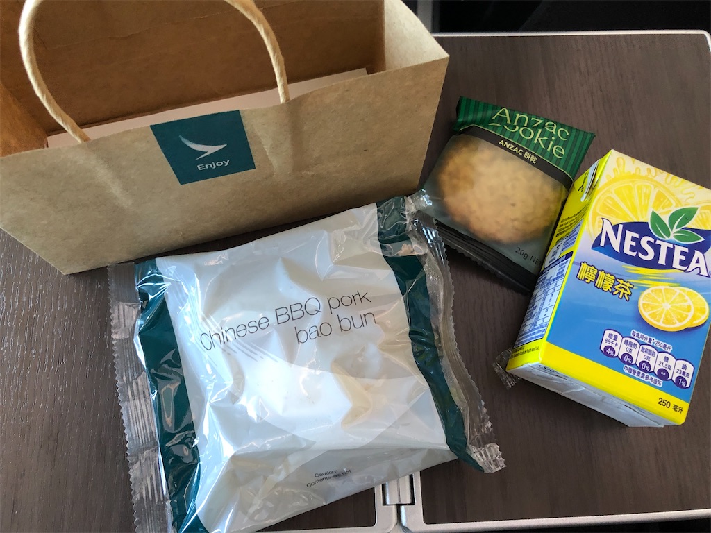 コロナ前は正午前後の便と夕食時間帯の便を除いて、パイのようなものだったりパオズ(包子)だったりと小麦粉系の軽食が紙パックのジュース(以前はネスレの凍檸茶)、クッキーと共に紙袋に入れて出されていたのですが、トレイに乗せられたご飯ものが出てくるようになった様子です。