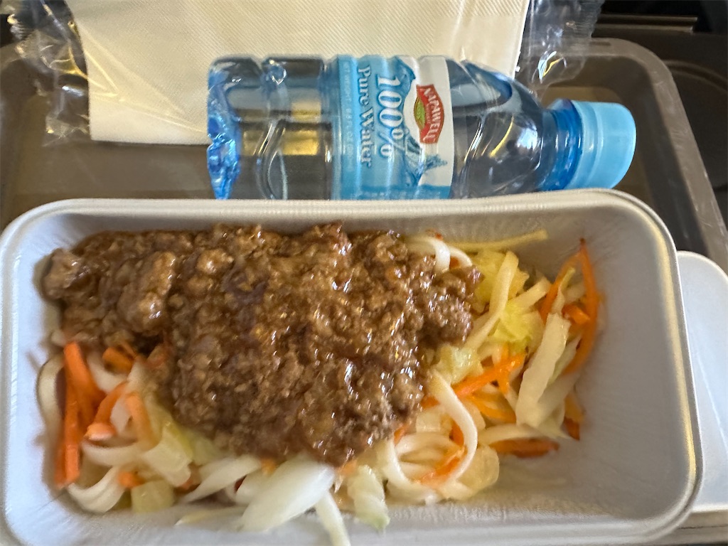 離陸して30分程度で機内食の配布。台北搭載だという「豬肉味噌扁麵」一択。日本語なら豚挽き肉味噌あんかけ麺と言ったところでしょうか。サンドイッチが出されるだけだった以前に比べて、きちんと軽食が出されるのようになったのは、ささやかながらも嬉しい変化です。