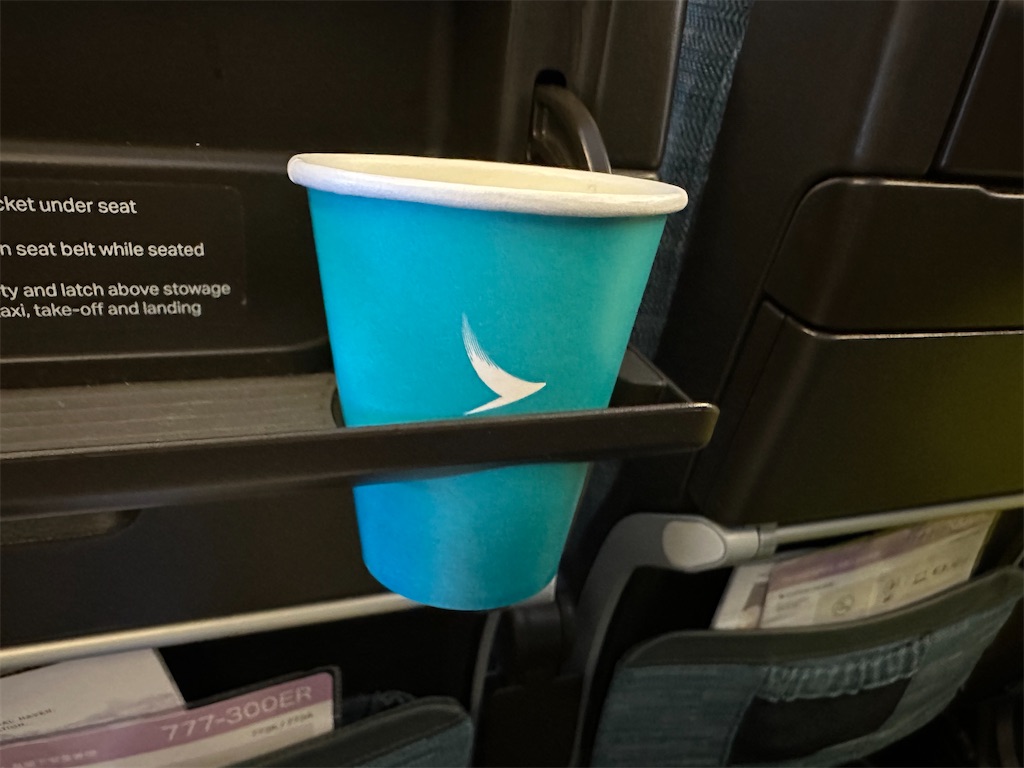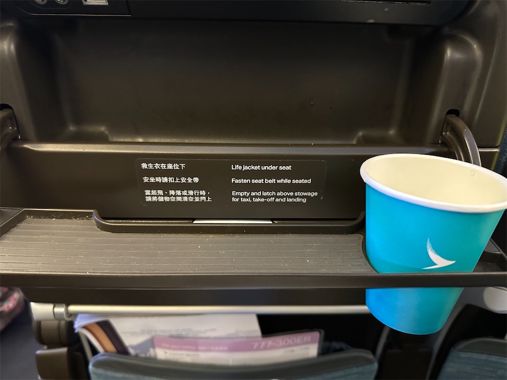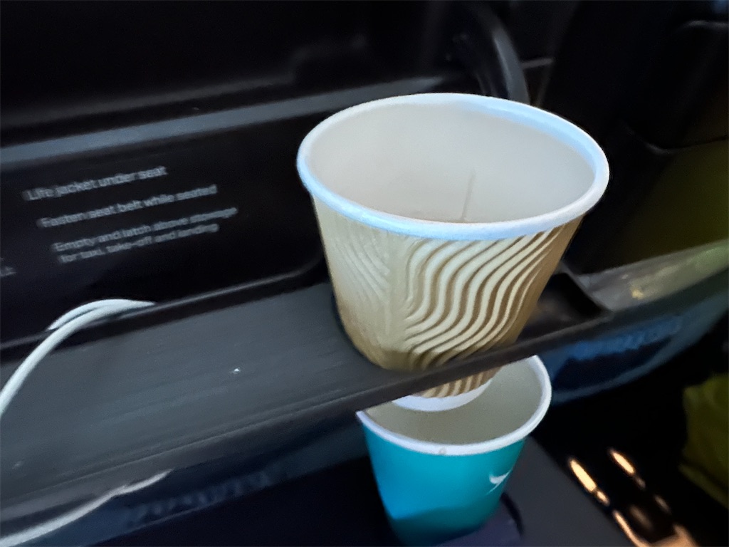 機内食トレー回収時に食後のコーヒーをいただきます。前に書いたかもなんですが、台湾系の航空会社と比べてキャセイのコーヒーはちょっとビターで美味しく感じるんですよね。ここは変わらないでいてくれてほっと安心。ホットだけに。