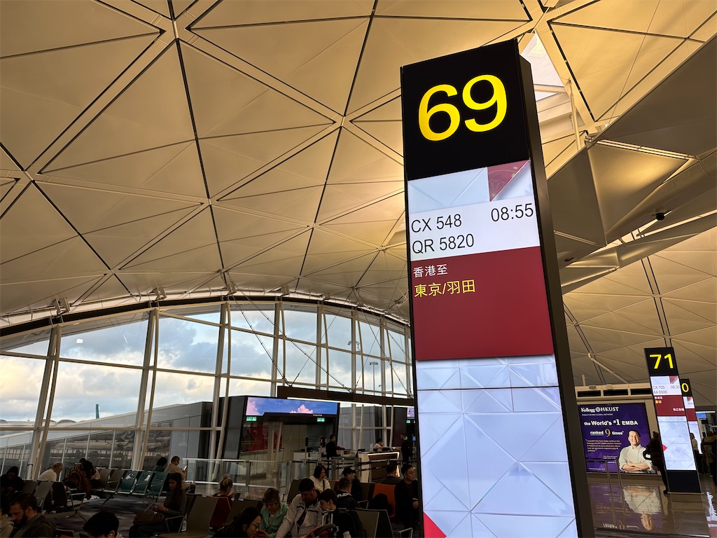 ちなみにこの便の搭乗口はYの字型のターミナルのほぼ末端にある69番。少し奥の70番は5分早く出発するキャセイのマニラ便で、出発35分前くらいから搭乗が始まっていたのに対し、東京便は出発20分前から搭乗開始。なんとなくバタバタしていたマニラ便に対して、落ち着いた雰囲気の東京便。ビジネス客が多いのかなとも思ったのですが、香港に卒業旅行へ来ていたとみられる日本人大学生グループなどもいました。