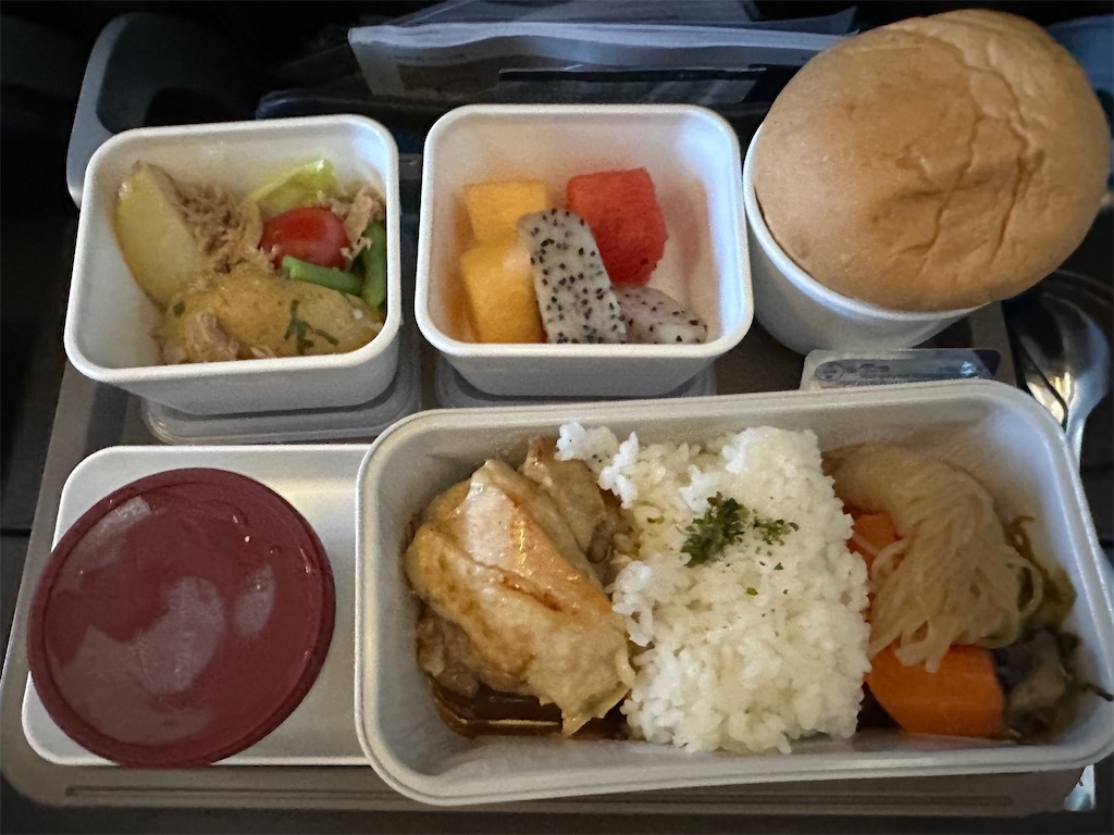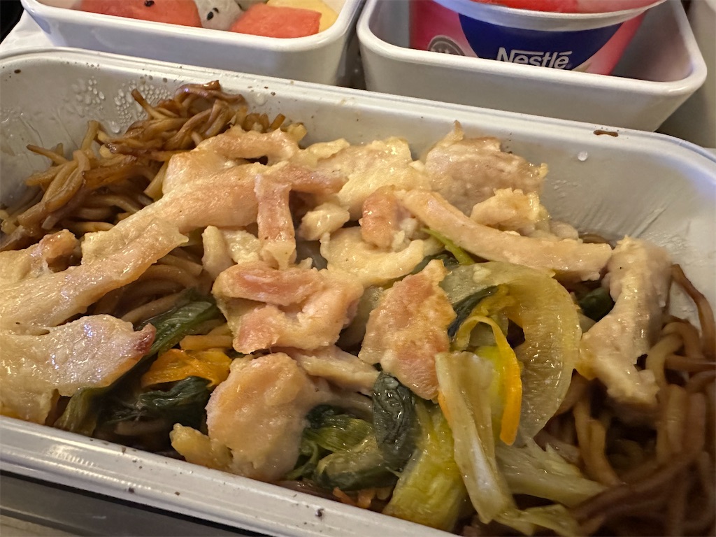 機内食はチキン焼きそばをオーダー。焼きそばと言っても日本のようなソースの味付けではなく、醤油を使った香港風。チキンがたくさん入っていて嬉しい。サラダはなく、カットフルーツがありました。そしてデザートにはハーゲンダッツを期待したのですが、ヨーグルト。十分美味しかったので満足です。
