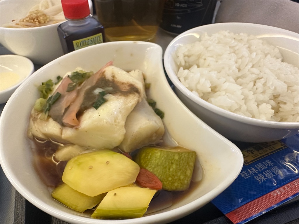 この日は多分「キャセイパシフィック航空ビジネスクラスで行く、台北3泊4日の旅」みたいなツアーに参加しているであろう高齢の日本人夫婦が多く、機内食のお伺いは非常にゆっくり。たまたま日本語のできるCAさんがいなかったせいか、本当に大変そうでしたが、根気良く対応していて頭が下がります。