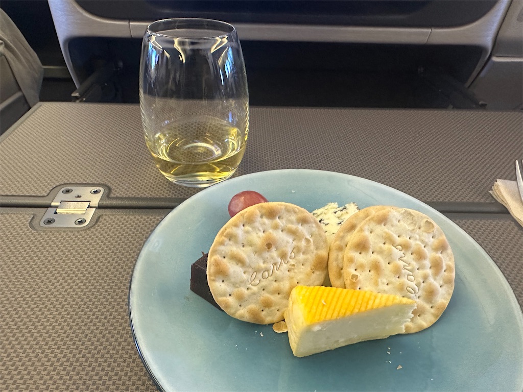 コロナ前はワゴンサービスだったこともあるフルーツやチーズ。ギャレーで盛り付けるのとどちらがやりやすいのかは分かりませんが、色々試行錯誤しているのが分かりますね。