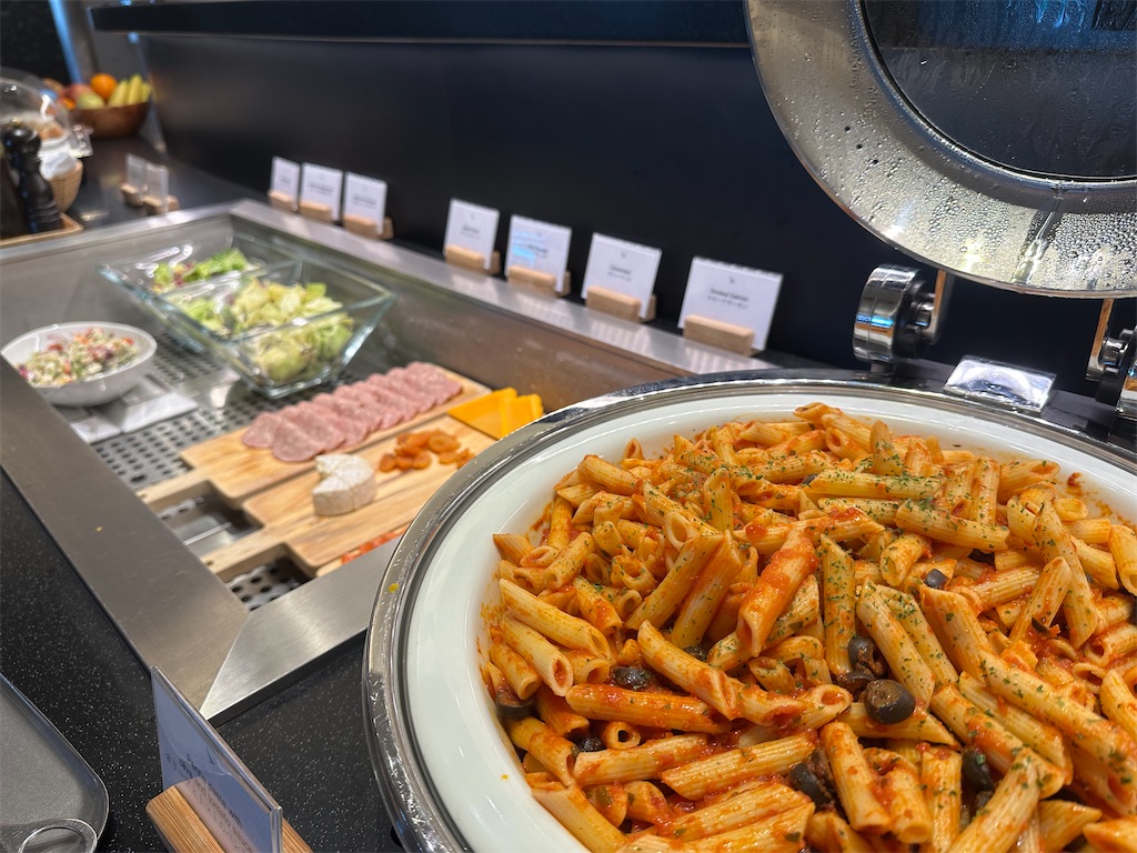 食事やドリンクの種類としてはKIXのラウンジとそんな変わりはないだろうけど、座席数の割に食べ物が置いてある空間がこぢんまりとし過ぎているので、品数が少なく見えるのかしら。